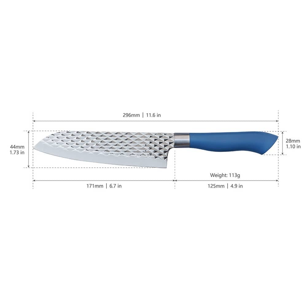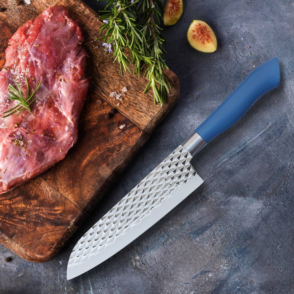 Combining the benefits of a chef’s knife and cleaver, this santoku is indispensable for chopping, slicing and dicing. Oval indentations on the blade’s sides reduce friction to produce clean, uniform cuts and minimize sticking.